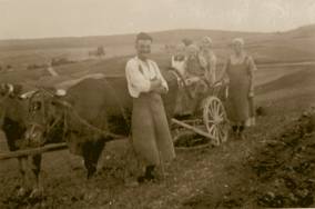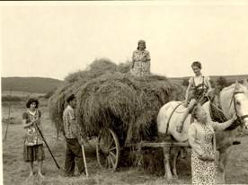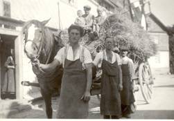 mit Pferde- oder Kuhgespannen in die Scheune. Hierbei half manchmal die ganze