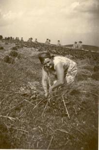 Foto links sieht man Marie Hofmann beim binden einer Garbe. Rechts auf dem