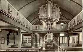 Innenansicht der Martinskirche zu Bärstadt im Jahr 1949 (noch mit dem alten Ofen, links) |