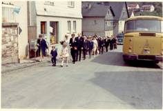 Brautpaare von Außerhalb wurden am gleichen Tag standesamtlich und kirchlich getraut, somit wurde eine Anfahrt gespart. Die Einheimischen wurden meist am Vortag standesamtlich und am darauffolgenden Tag kirchlich getraut. Die Trauung fand Sonntagsmittags um 14.00Uhr in der Kirche statt. Hierzu gingen die Brautleute und die Hochzeitsgäste gemeinsam in einem Zug zur Kirche. Nach dem Krieg wurde es Brauch, dass während der Hochzeit in der Kirche, die Kinder das alte Eisentor zur Kirche zubanden. Der Bräutigam warf einige Geldstücke und bekam eine Schere zum Aufschneiden des Bandes. Der Hochzeitszug bewegte sich dann in der Regel zum Hause der Braut. Bei der Ausrichtung der Hochzeitsfeier halfen viele Verwandte und Nachbarn mit. Es wurde mit Geschirr, Besteck oder Möbeln ausgeholfen. Außerdem wurden Eier und Butter gesammelt um eine ganze Anzahl von Kuchen zu backen. Wer wenig Geld hatte holte sich mit den Lebensmittelmarken Pferdefleisch, davon gab es nämlich die doppelte Menge. Gegen 15.00Uhr wurde Kaffee getrunken und die Verwandten und Gäste bekamen den selbstgemachten Kuchen. Allen anderen, die etwas geschenkt hatten, wurde von den